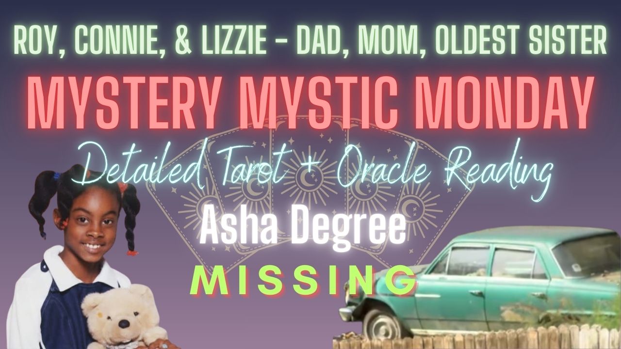 There has been some movement in the Asha Degree case and I wanted to explore what are the thoughts, feelings, and intentions of those who have been fingered by police as being involved in the disappearance of Asha Degree. Parts 1-6 | Detailed Oracle Reading | Recorded on September 29, 30, 2024 Part 7 | … Continue reading ASHA DEGREE | Mystery Mystic Monday | A Closer Look | TAROT & ORACLE PSYCHIC Readings | Ep. 177 and 178