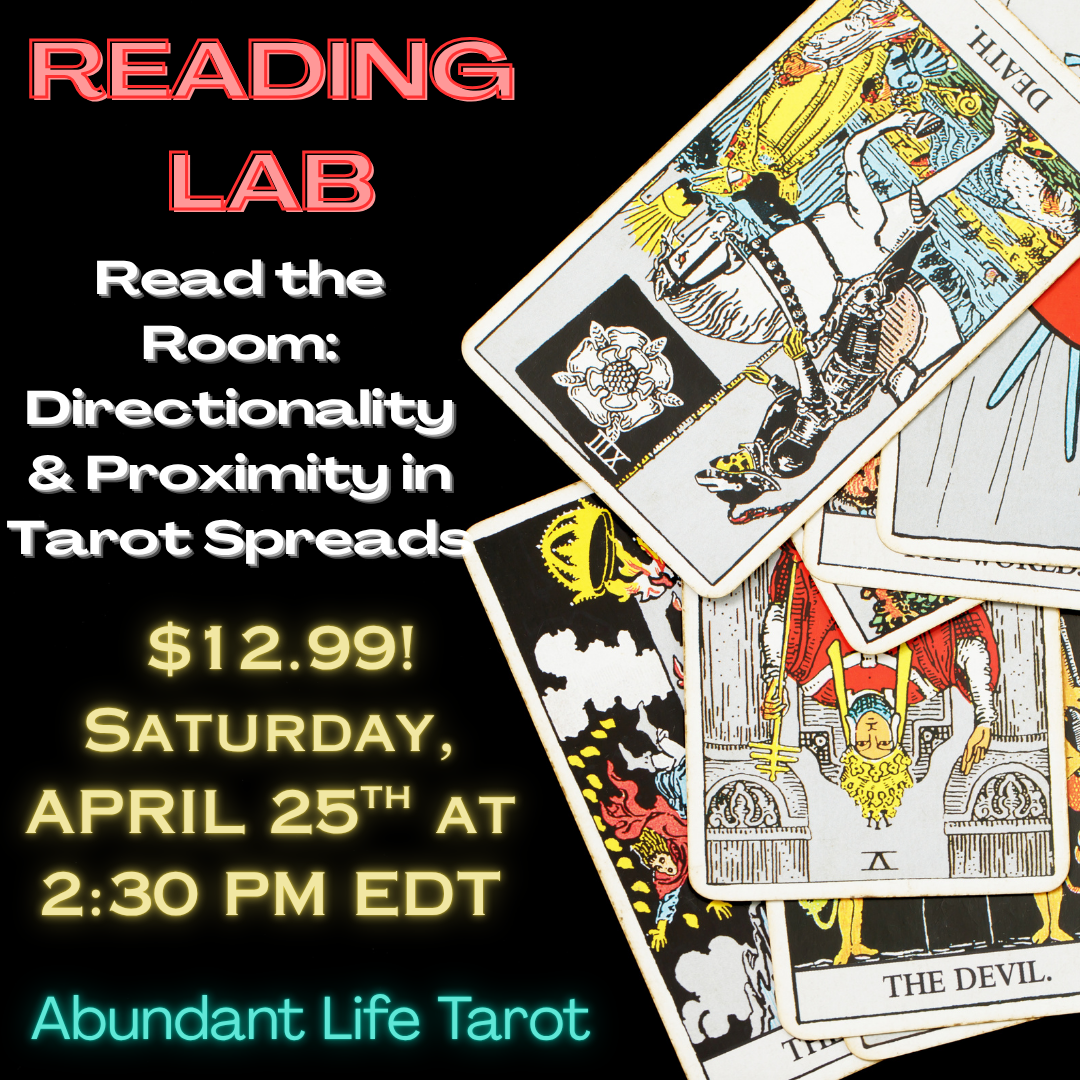 I will be hosting a live Zoom Reading Lab, where we get to practice how to read Tarot with the powerful tool of interpreting how the characters are interacting with each other and with the adjacent cards. You do not want to miss this! This Reading Lab is great for beginners and seasoned readers!