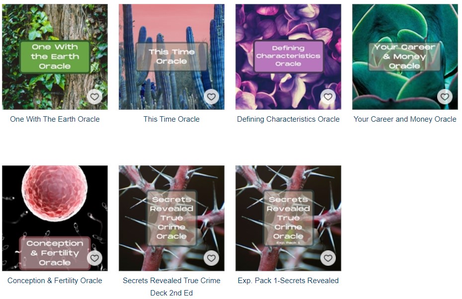 The six decks that are listed right now are: One With the Earth Oracle, Defining Characteristics Oracle, Conception & Fertility Oracle, Secrets Revealed True Crime Oracle, This Time Oracle, and Your Career & Money Oracle.