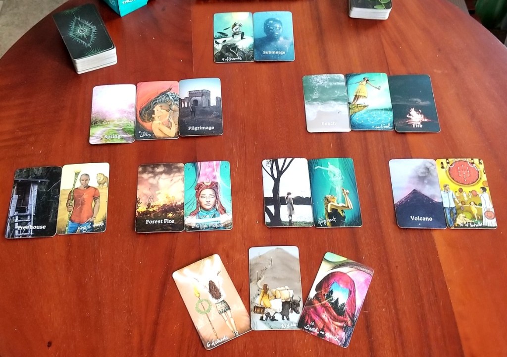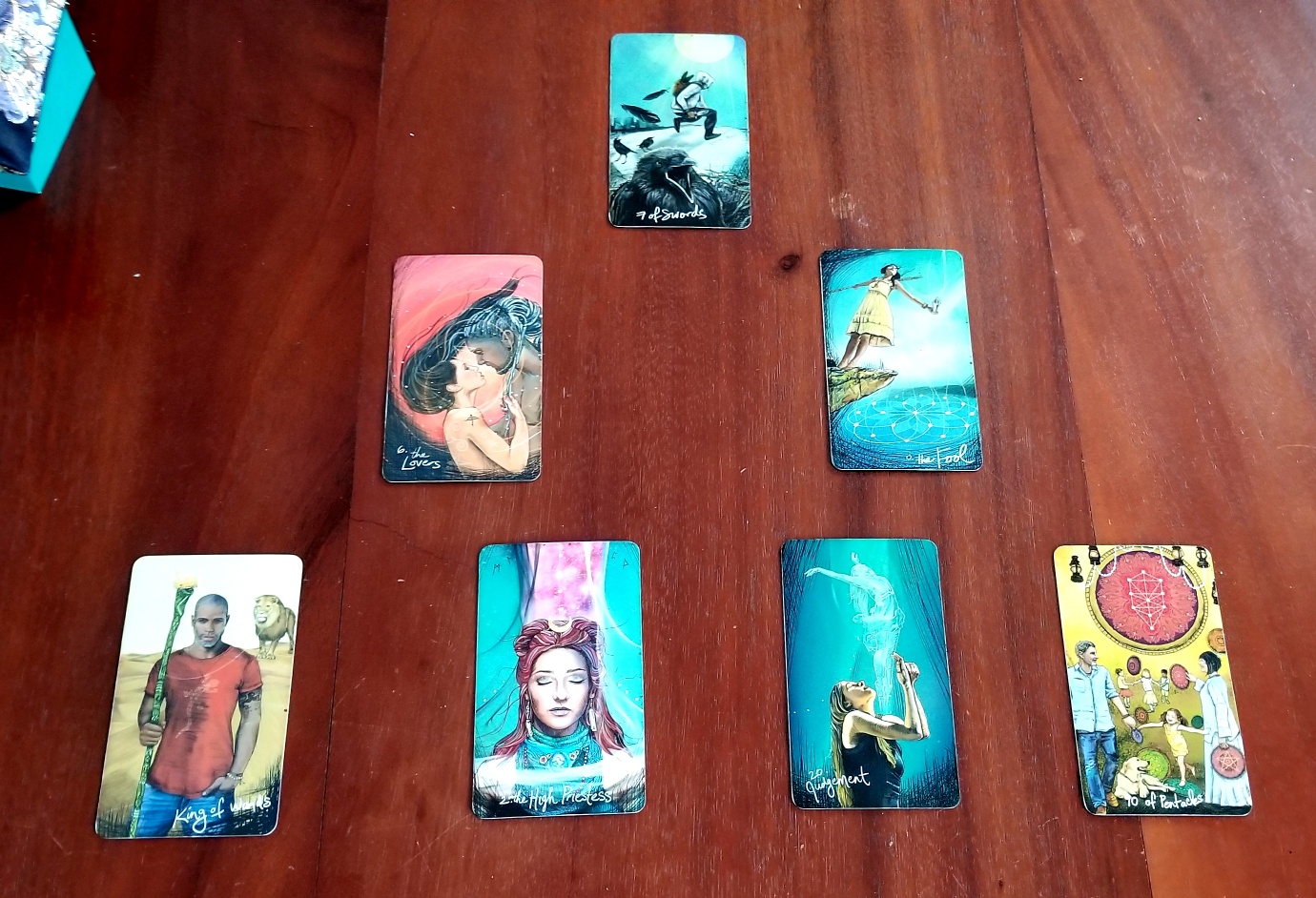 From the ALTA course, Choosing Your Next Deck, Curating Your CollectionMy spread including Tarot cards…Parsed down version of the spread, with just the Tarot cards…