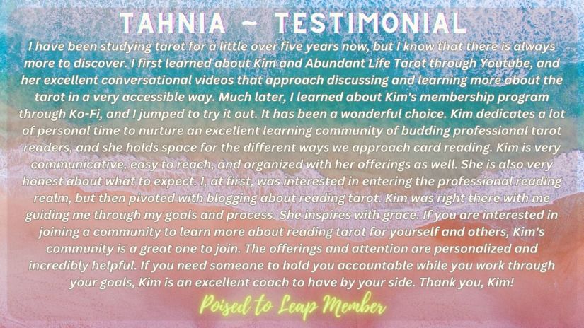 There are many benefits to joining Poised to Leap on Ko-fi, with the main one being able to connect with me and other like-minded souls to learn and grow in Tarot…together!
