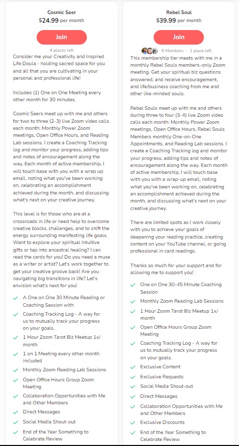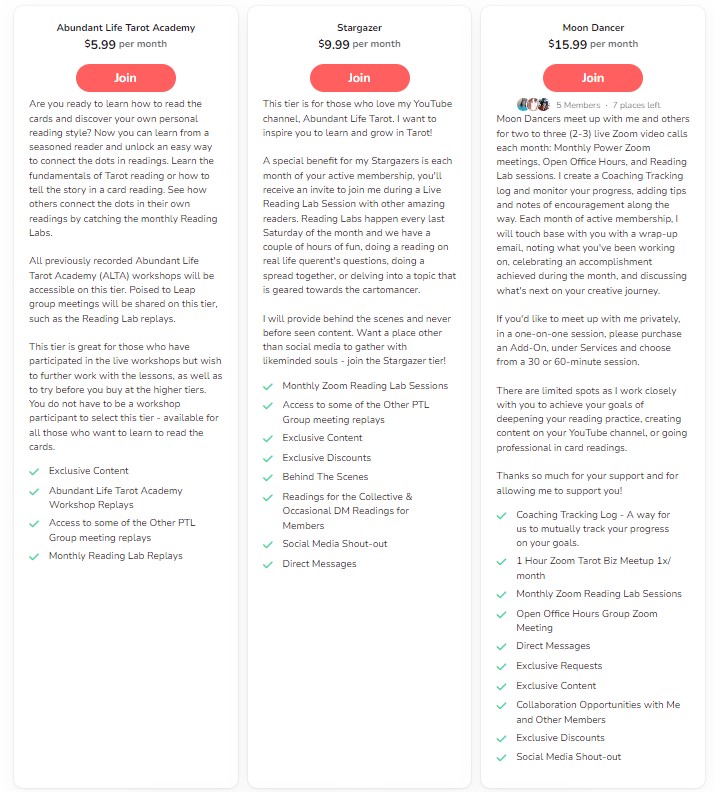 Ko-fi allows those who wish to make one-time donations or to provide ongoing support to Abundant Life Tarot. But, what I am most excited about is offering membership tiers to house my mentorship program!